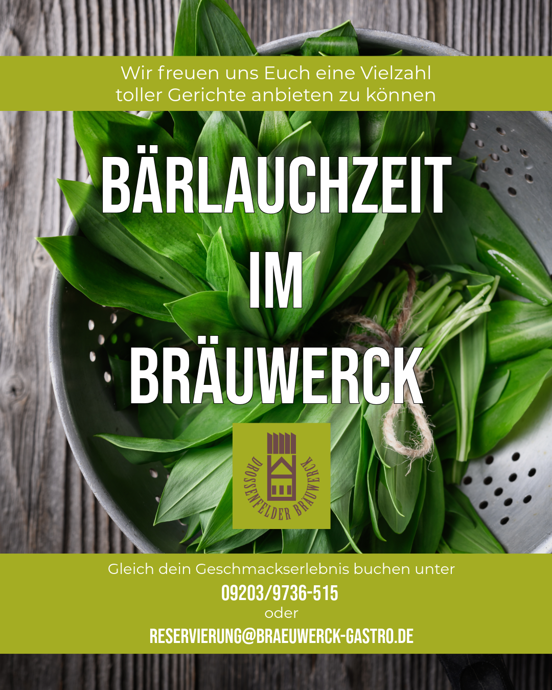 Bärlauchspezialitäten im Bräuwerck Von Suppen über Pasta - lassen Sie sich überraschen, was unsere Küche sich Woche für Woche in der Saison einfallen lässt. Wir freuen uns über Ihren Besuch - reservieren Sie sich gleich einen Tisch über